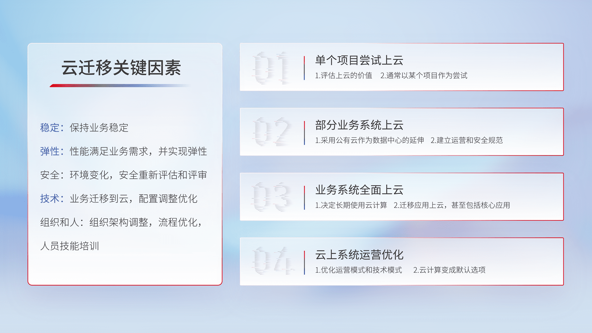 结合实际业务,,,,从规划设计、、云平台选型、、云原生改造、、数据迁移、、、集成交付,,迁移全过程为客户识别最佳上云路径,,做好风险识别管理,,设计网络架构、、、、身份权限、、安全审计合规、、、、操作审计、、、日志审计、、、、监控告警策略、、、、多站点容灾设计等,,,对云上基础设施进行整体规划,,,,提升IT治理水平,,以满足弹性、、、高可用、、、高性能的需求。。。。