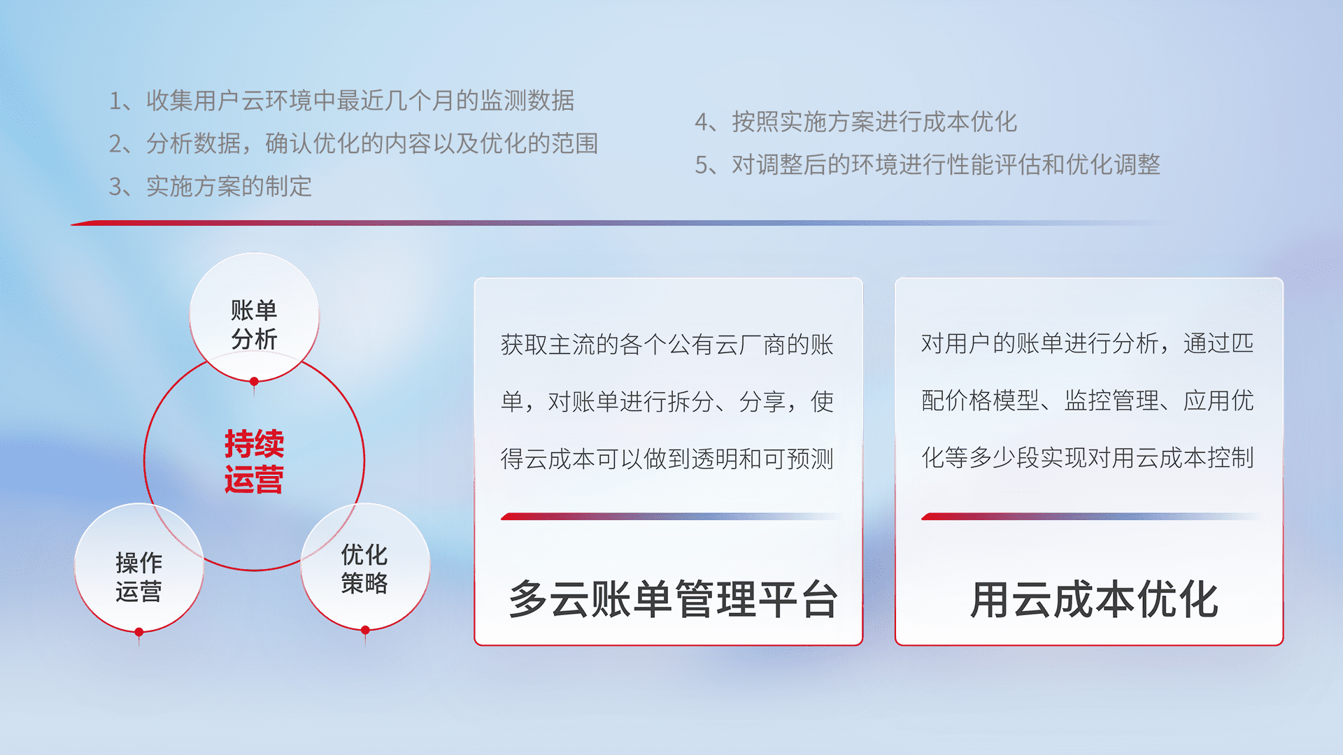 通过多云纳管,,,以统一的资源数据模型把客户的云资源进行抽象和封装,,进而实现对多云资源的统一操作,,,,保障云资源管理的可靠性、、、稳定性与可用性。。。量身定制化运维内容,,,配置、、、、开发运维、、、补丁管理、、、备份、、、监控、、认证和访问管理、、审计和日常巡检等,,,,保障在用云过程中的可靠度,,稳定度以及高可用率。。。