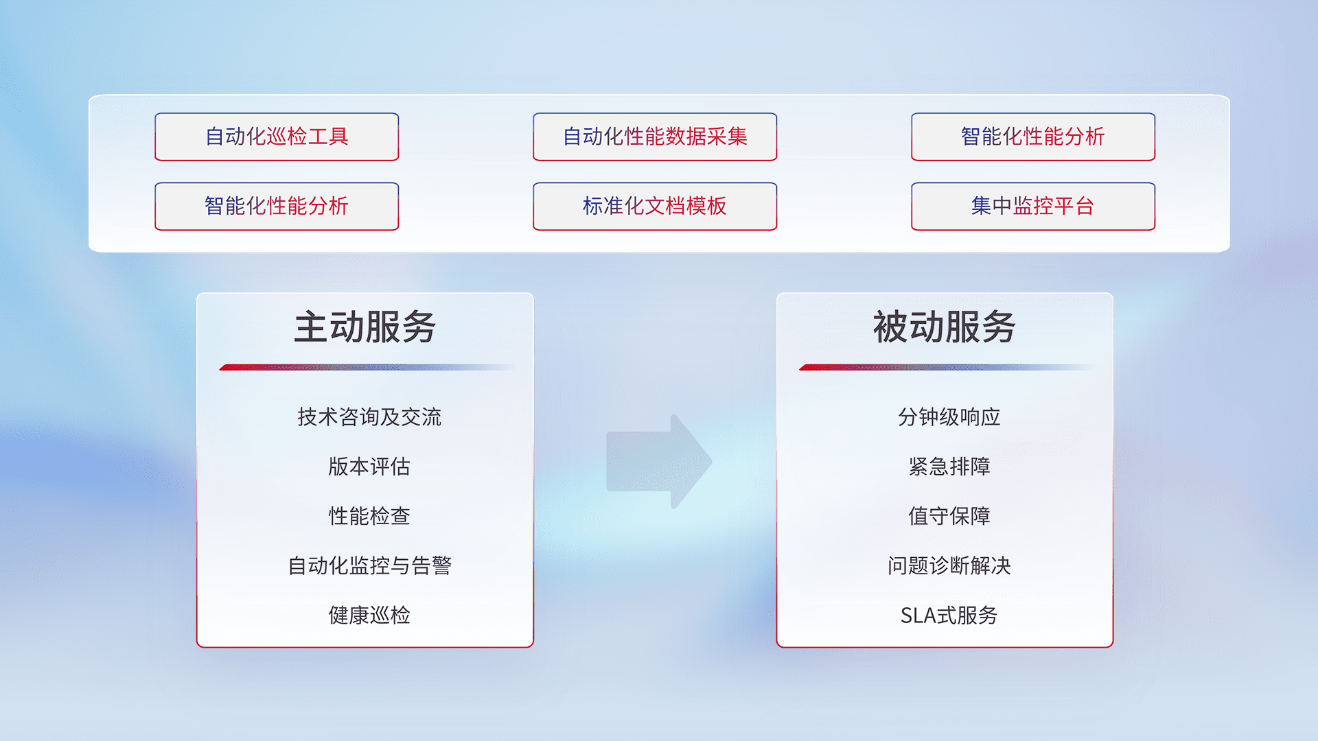 智能化工具和标准化文档,,保障服务质量,,,,提供主动服务(包含技术咨询、、版本评估、、、、性能检查、、自动化监控与告警、、健康巡检)和被动服务包含(分钟级响应、、紧急排障、、值守保障、、问题诊断解决、、、SLA服务)。。。